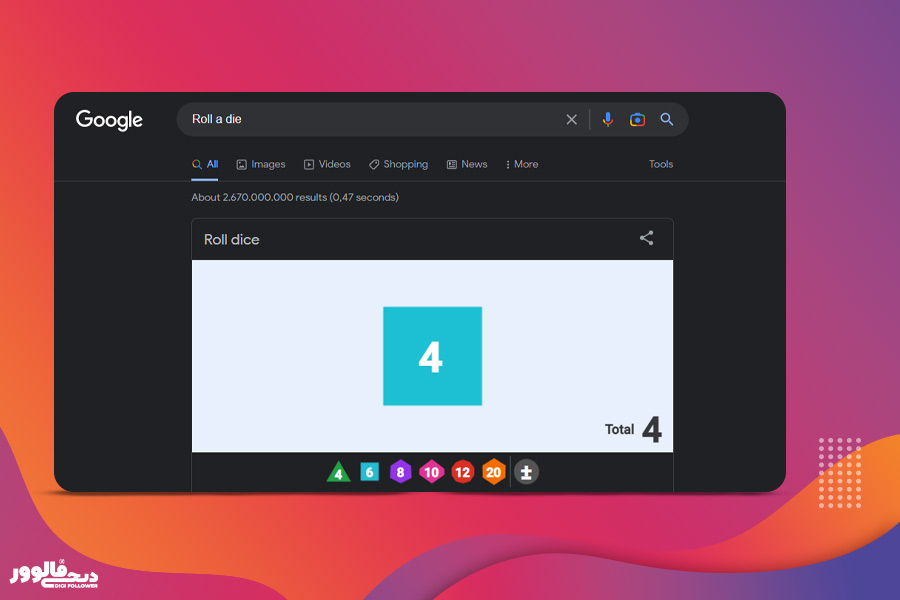 برای استفاده از این قابلیت در گوگل کافی است که عبارت roll a die را در گوگل سرچ کنید. با انجام این کار در صفحه نتایج، بخشی به شما نمایش داده میشود. در این بخش میتوانید مشخص کنید که تاس مد نظرتان چند وجهی باشد. از 4 وجه تا 100 وجه وجود دارد. با زدن دکمه Roll تاس برای شما انداخته میشود.
